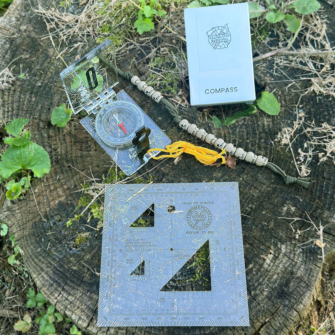 Basic Land Navigation Kit: Our basic land navigation kit consists of a protractor, compass, watch, and pace count beads (or Ranger beads). Just add a pencil and applicable map and off you go. Our protractor is scaled for 1/25,000 meters, 1/50,000 meters, 1/100,000 meters, and 1/250,000 meters. Our compass has 360 degrees for accurate navigating. Our handmade pace count/Ranger beads are able to easily slide for accurately counting your pace. The watch can be used to both determine your direction (using the watch method) and as a quicker way to count your pace. Using our kit, you are able to know your direction and distance to find your destination every time.