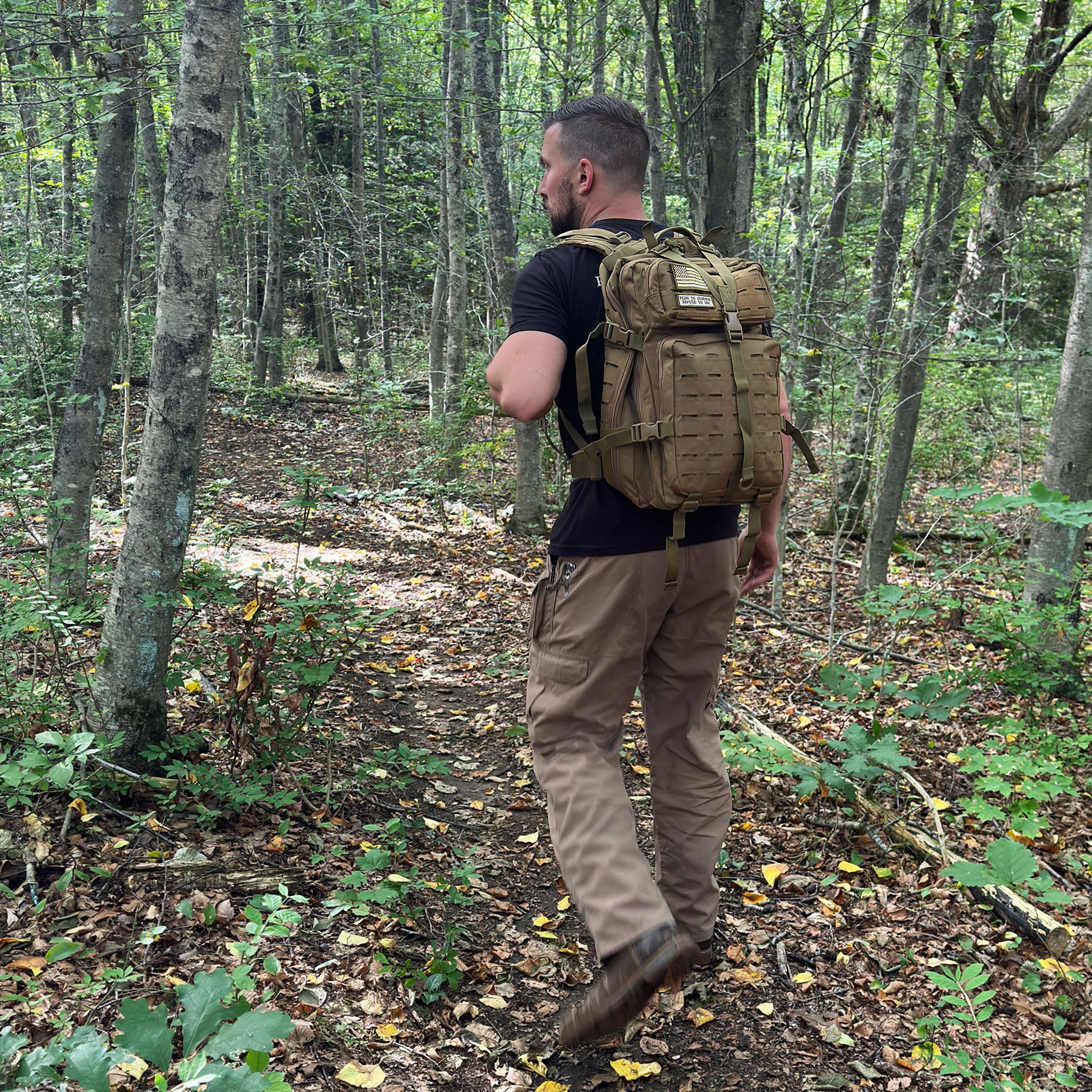 Tan Rucksack: Our provided rucksack is made of 1000D Nylon and is water resistant. All the included pockets and compartments makes packing, organizing and carrying your gear easy.